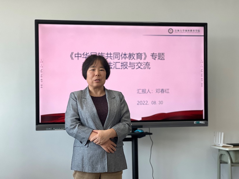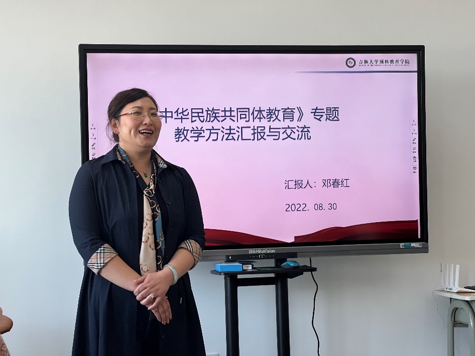邓春红老师本次分享的主题是《中华民族共同体教育》专题的教学方法。她介绍了根据课程内容和预科学生特点所采用的自主学习教学法、情境式教学法、案例教学法、实践活动教学法、探究式教学法,展示了教学效果和学生反馈,并谈了自己在教学实践中的体会和感悟。